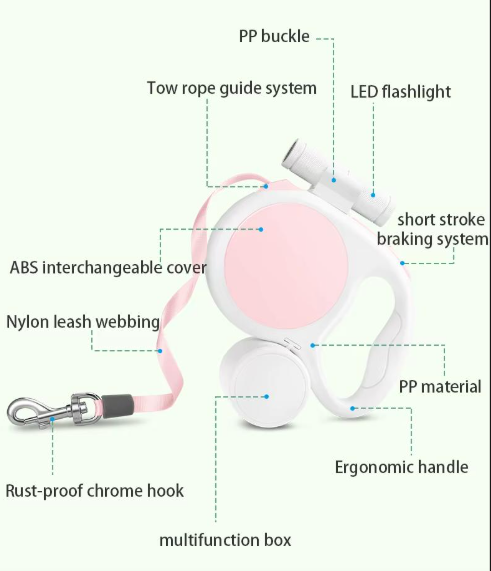 Retractable Pet Leash 360° Tangle-free With Light And Storage